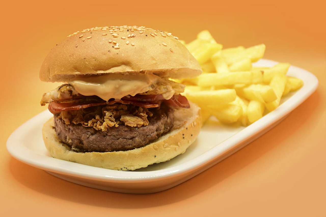 A nossa receita começa com uma suculenta carne de vaca grelhada, temperada com sal e pimenta para realçar o sabor. Em seguida, adicionamos cebola caramelizada, com a sua doçura irresistível, da-lhe aquele toque. O bacon crocante oferece uma textura defumada e estaladiça, enquanto o ovo estrelado adiciona cremosidade.
