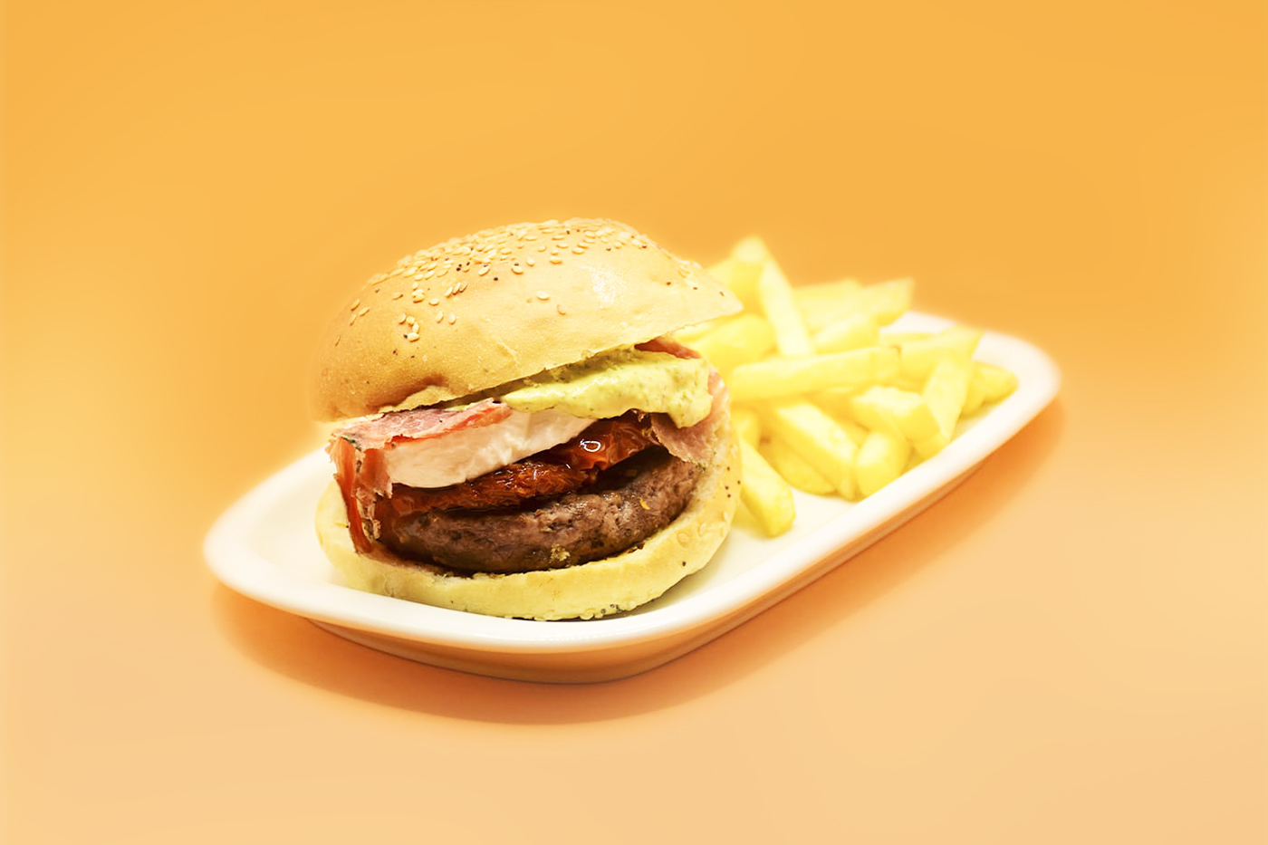 Um suculento hambúrguer de vaca grelhado, garantindo a suculência e o sabor característico da carne. Para adicionar um toque mediterrâneo, incluímos tomate seco, com sua textura macia e sabor intenso.